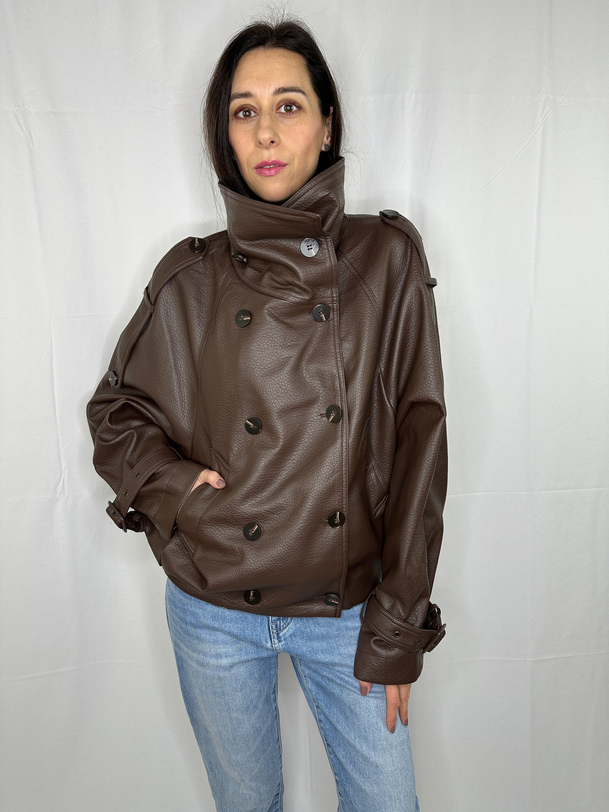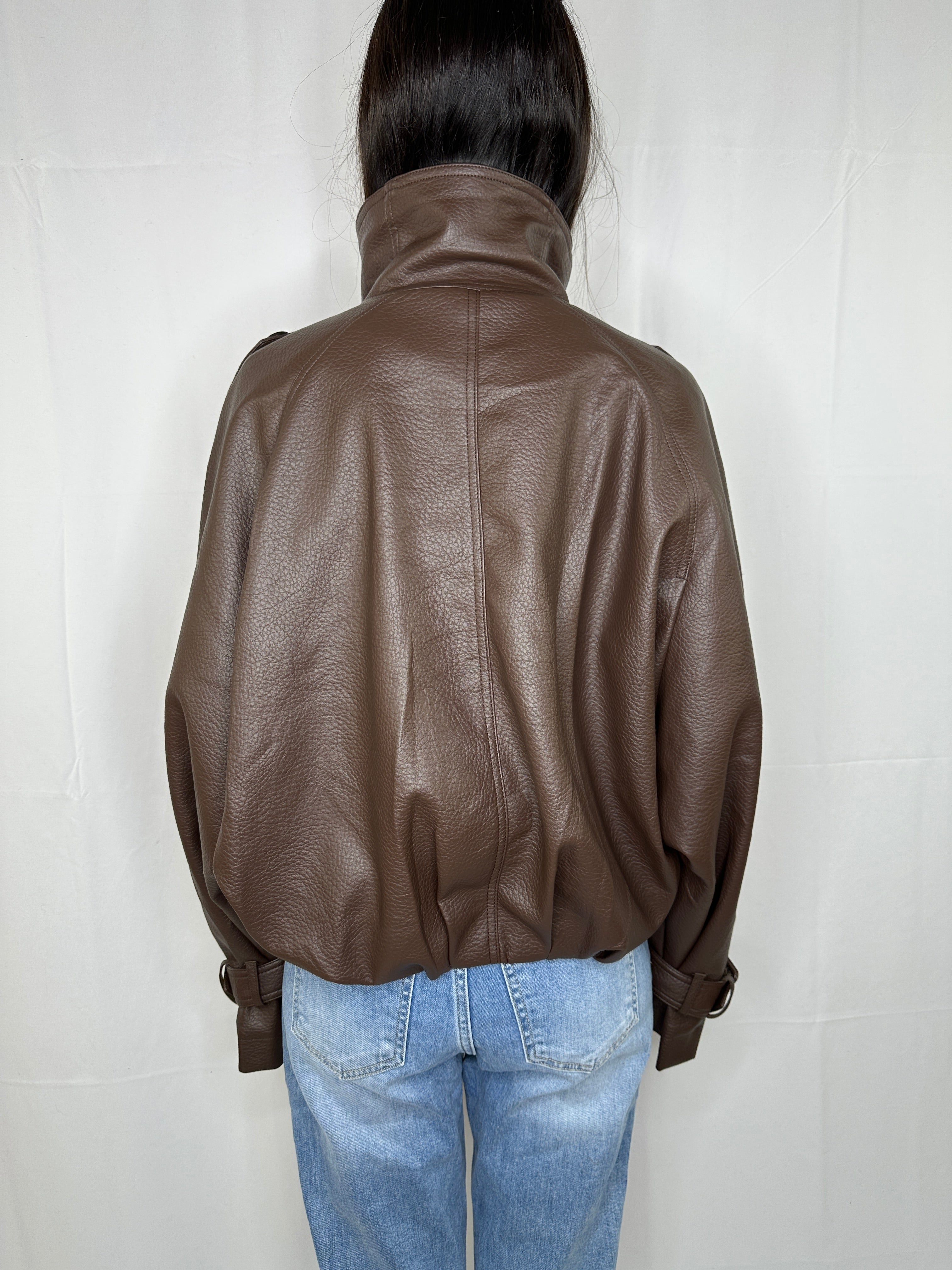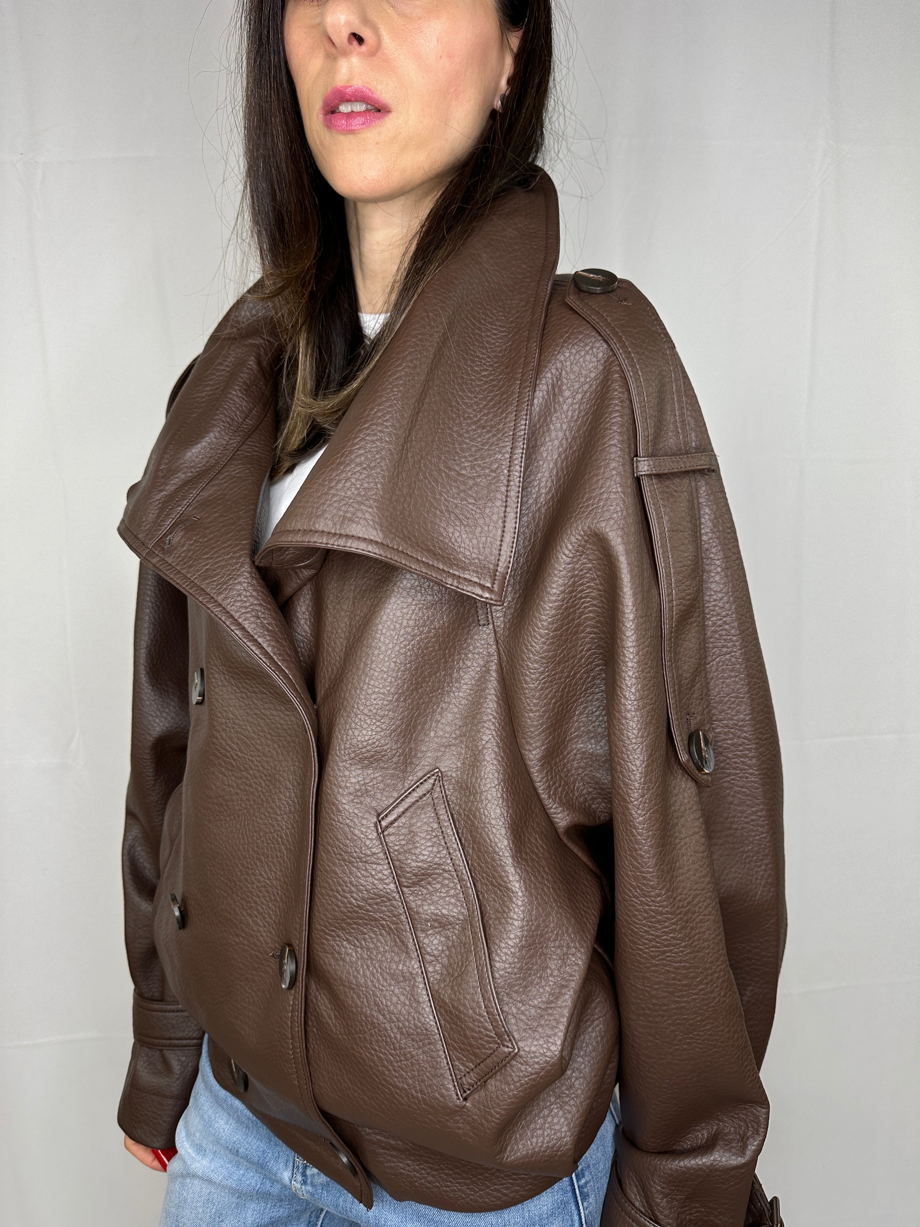 Chiodo oversize in pelle martellata con collo alto. Tg unica, veste fino tg 46.