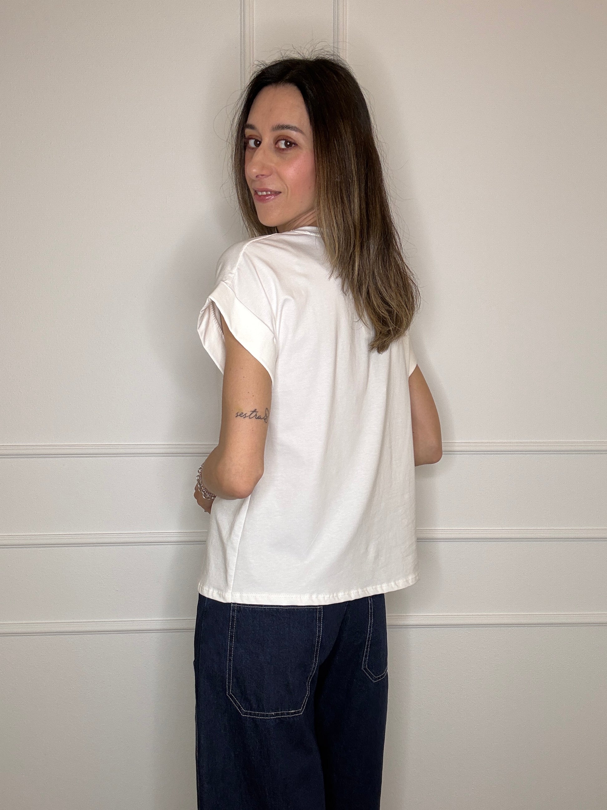 T-shirt stampata, vestibilità morbida. Tg unica, veste fino tg 46.